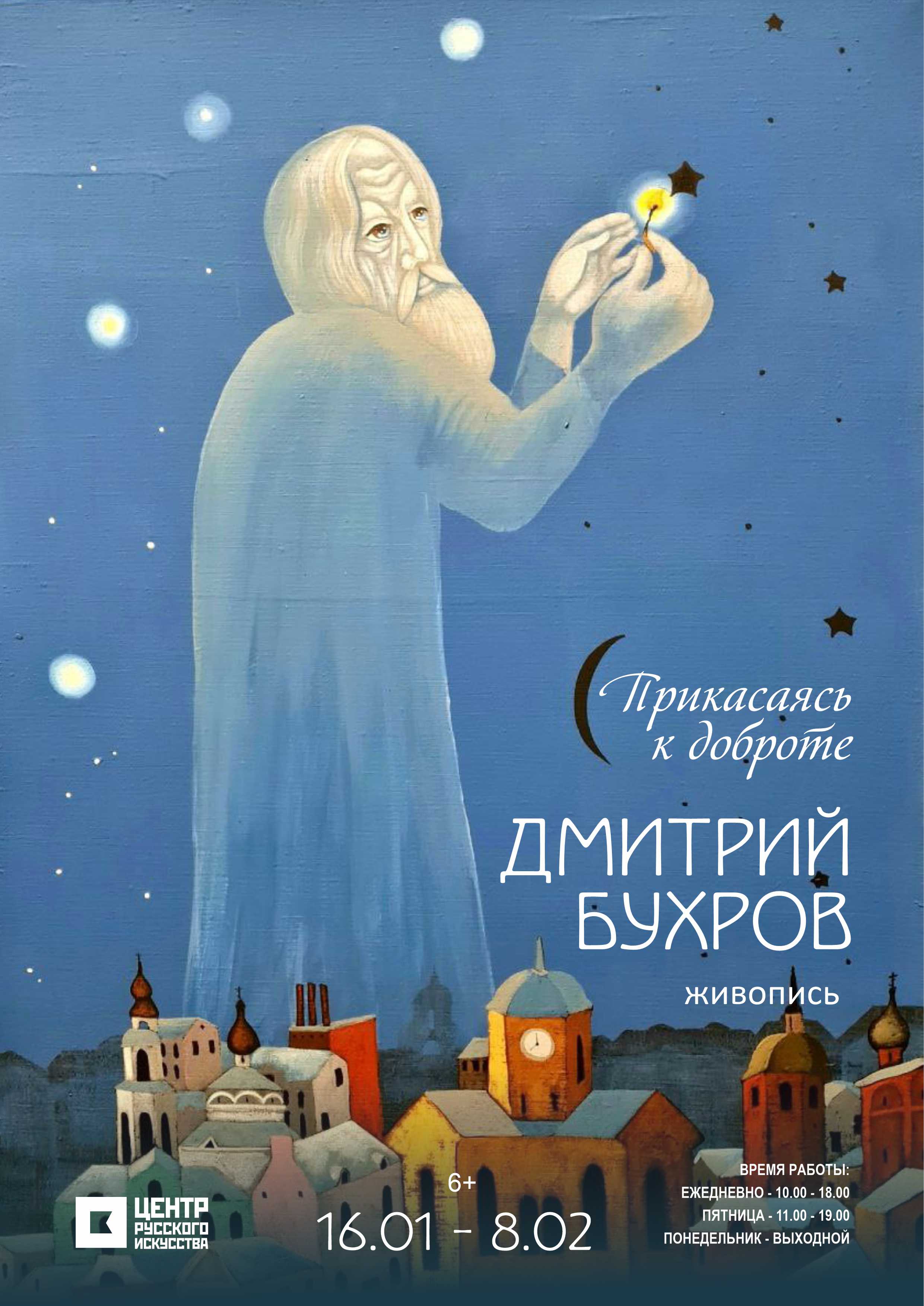 «Прикасаясь к доброте» - проект, погружающий зрителя в мир, наполненный чувством светлой грусти, тонким юмором и иронией. Религиозные образы, герои, проникнутые задумчивым настроением, комические истории, яркие бытовые сценки и мотивы актуальной городской культуры – всё это представлено в рамках выставки. Он соединяет противоположности, создавая узнаваемые архетипические образы, религиозные символы и зарисовки повседневной жизни. Дмитрий работает в узнаваемой колоритной манере и смелой стилизации. Работы художника привлекают отечественных и зарубежных ценителей современной живописи – автор гармонично сочетает элементы различных культур и сюжетов.